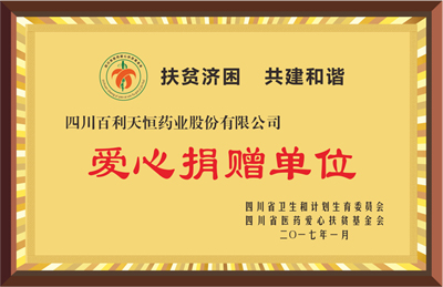 2016年和2017年,向四川省醫藥愛心扶貧基金會首批醫療愛心救助項目捐贈,榮獲“愛心捐贈單位”稱號。
